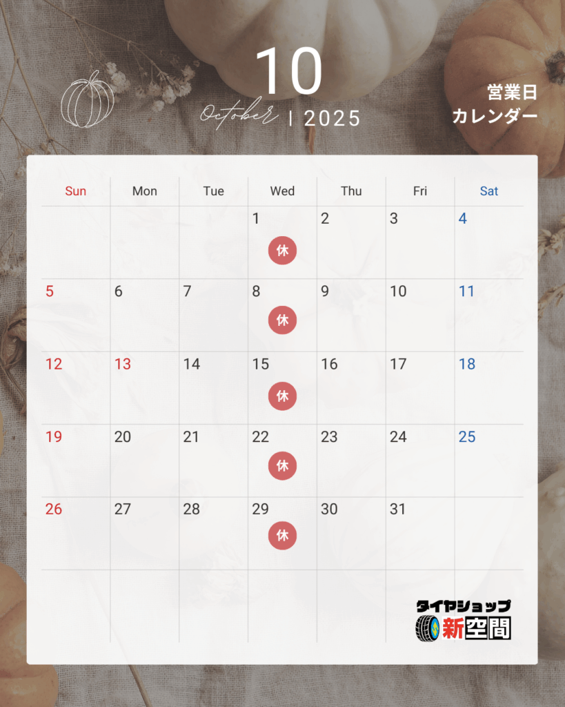 こんにちは!タイヤショップ新空間です!2025年10月の定休日をお知らせいたします!定休日は水曜日になります。スタッドレスタイヤへの早期交換も大歓迎です✨ご予約、不明点あれば店舗にご連絡ください😊今後ともタイヤショップ新空間をよろしくお願いいたします!