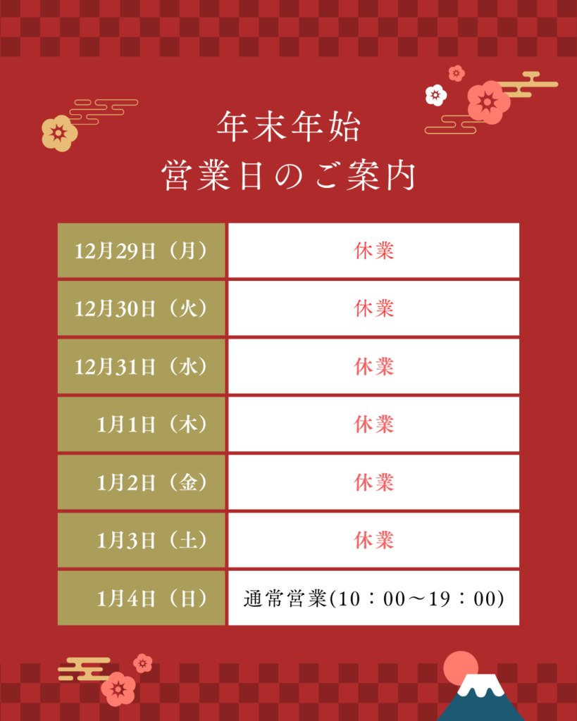 12/26㈮のみ10:00~17:00までの営業になります。12/27、12/28は通常営業(10:00~19:00)ですのでよろしくお願いいたします。冬タイヤの交換はお済でしょうか?雪が本格的に降る前にぜひ!タイミー、電話どちらからでも可能です!TEL:022-398-8909