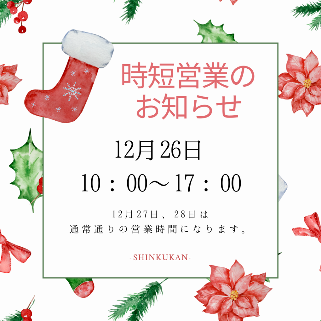 こんにちは!タイヤショップ新空間です!12月の時短営業日、年末年始についてのお知らせです!