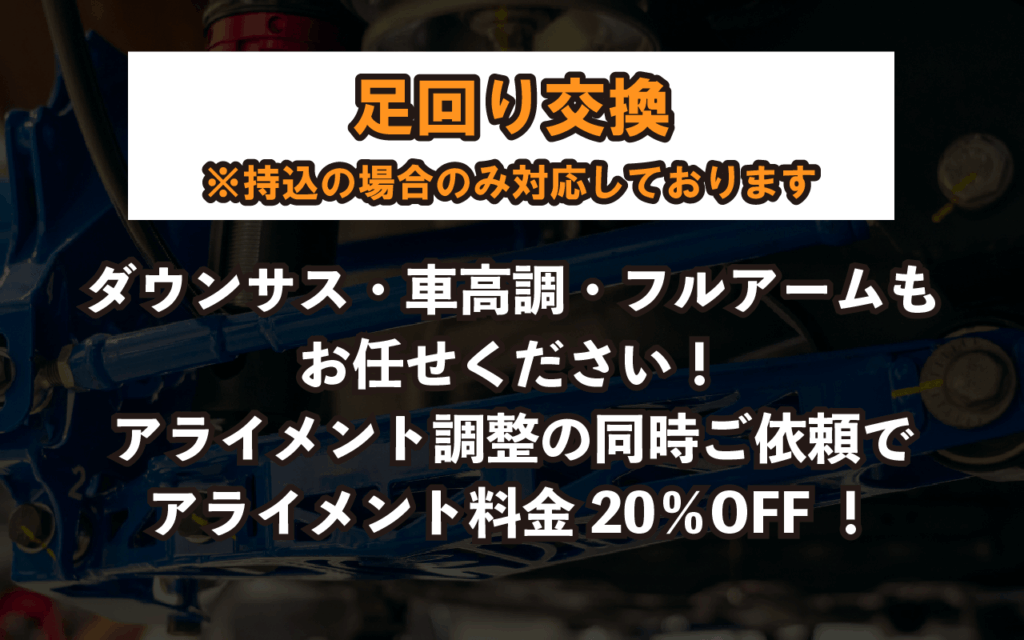 足回り作業と同時のご依頼で、アライメント料金20%引きとなっております。